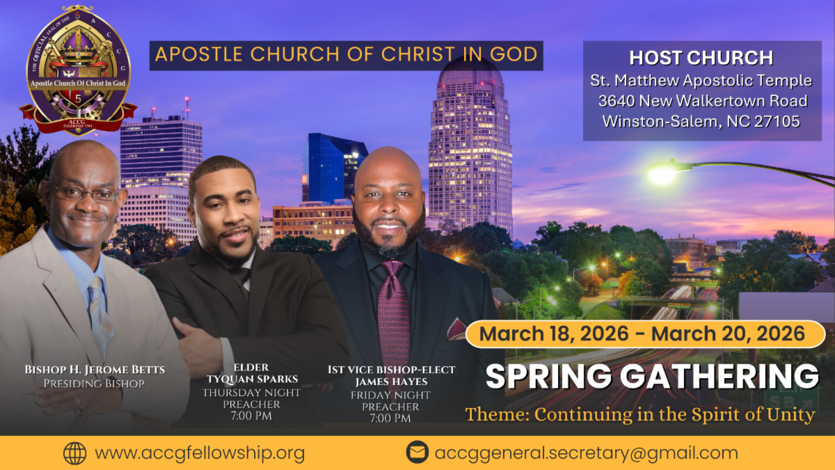 Join us for the ACCG Spring Gathering in Winston-Salem, NC (March 18β20, 2026) at St. Matthew Apostolic Temple.